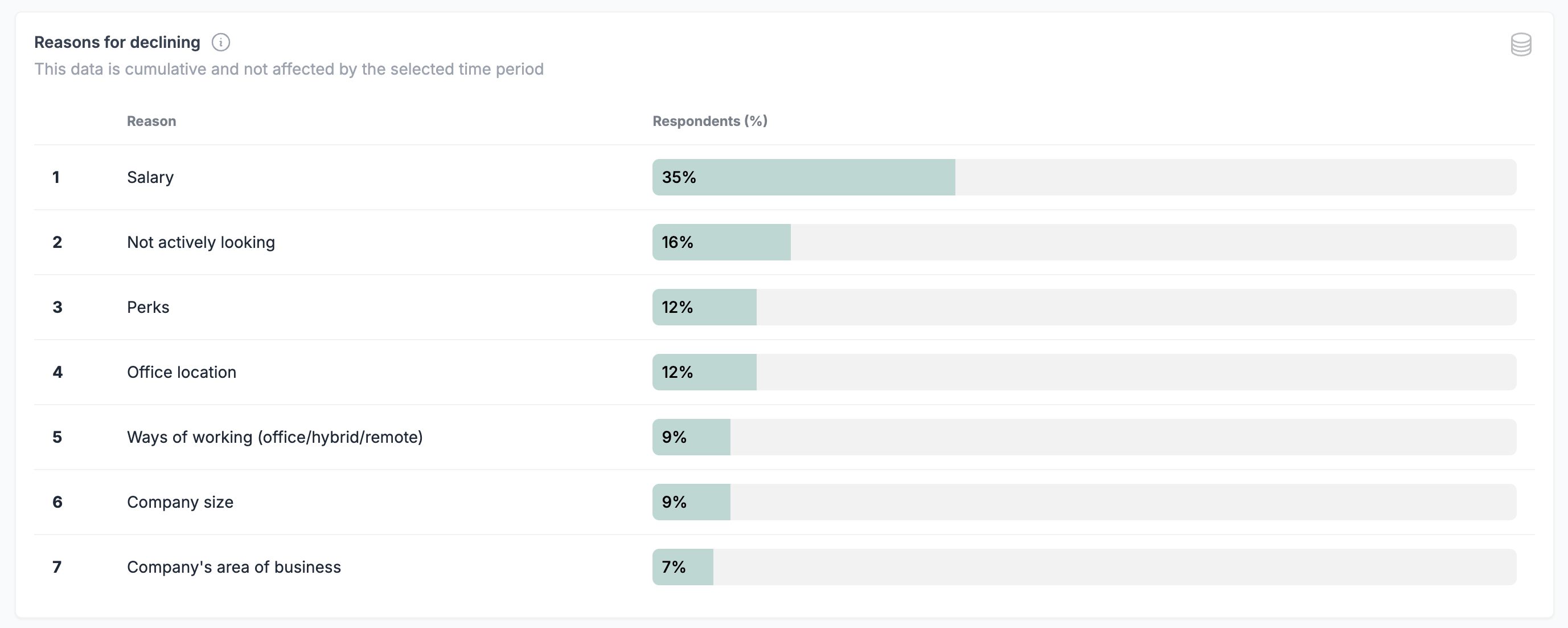 A candidate can select multiple reasons for declining. The ratios are calculated accordingly.