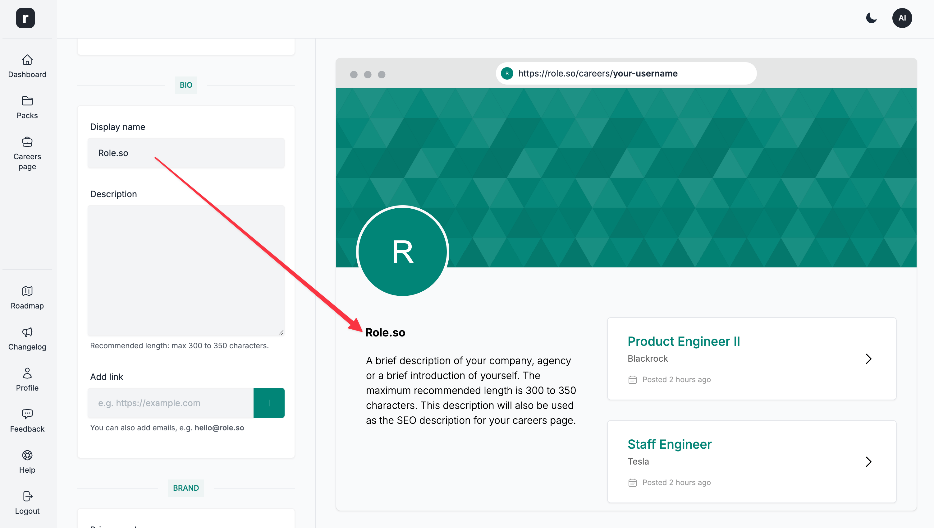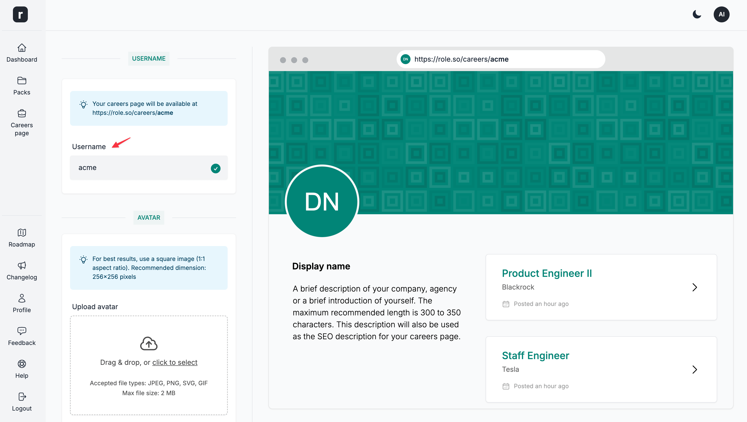 Your careers page will be available under this username (e.g. https://role.so/careers/USERNAME). If you have a custom domain configured, the careers page will be available at https://YOUR-DOMAIN.com/careers/USERNAME.
