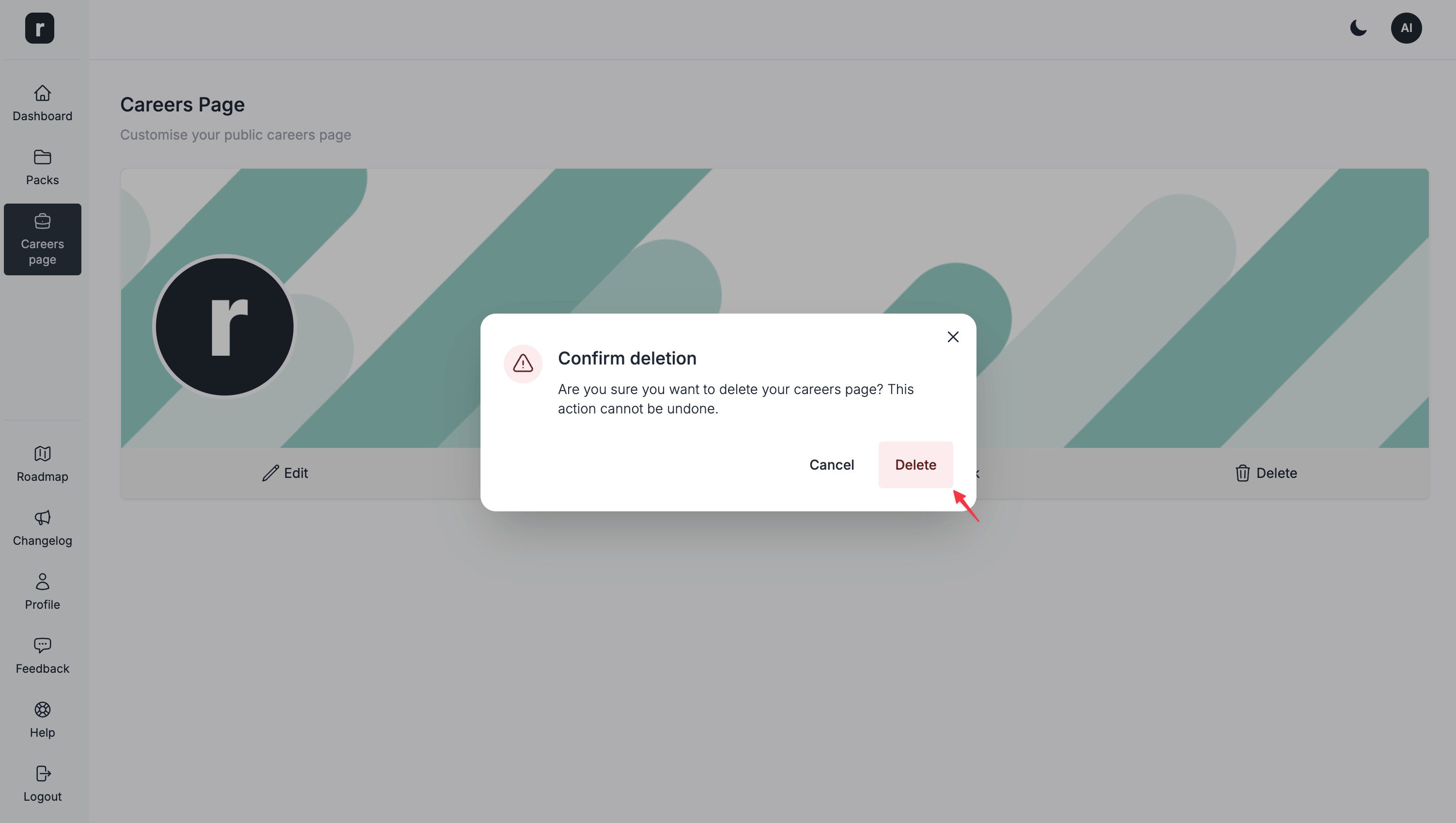 Deletebutton on the confirmation modal to delete your careers page