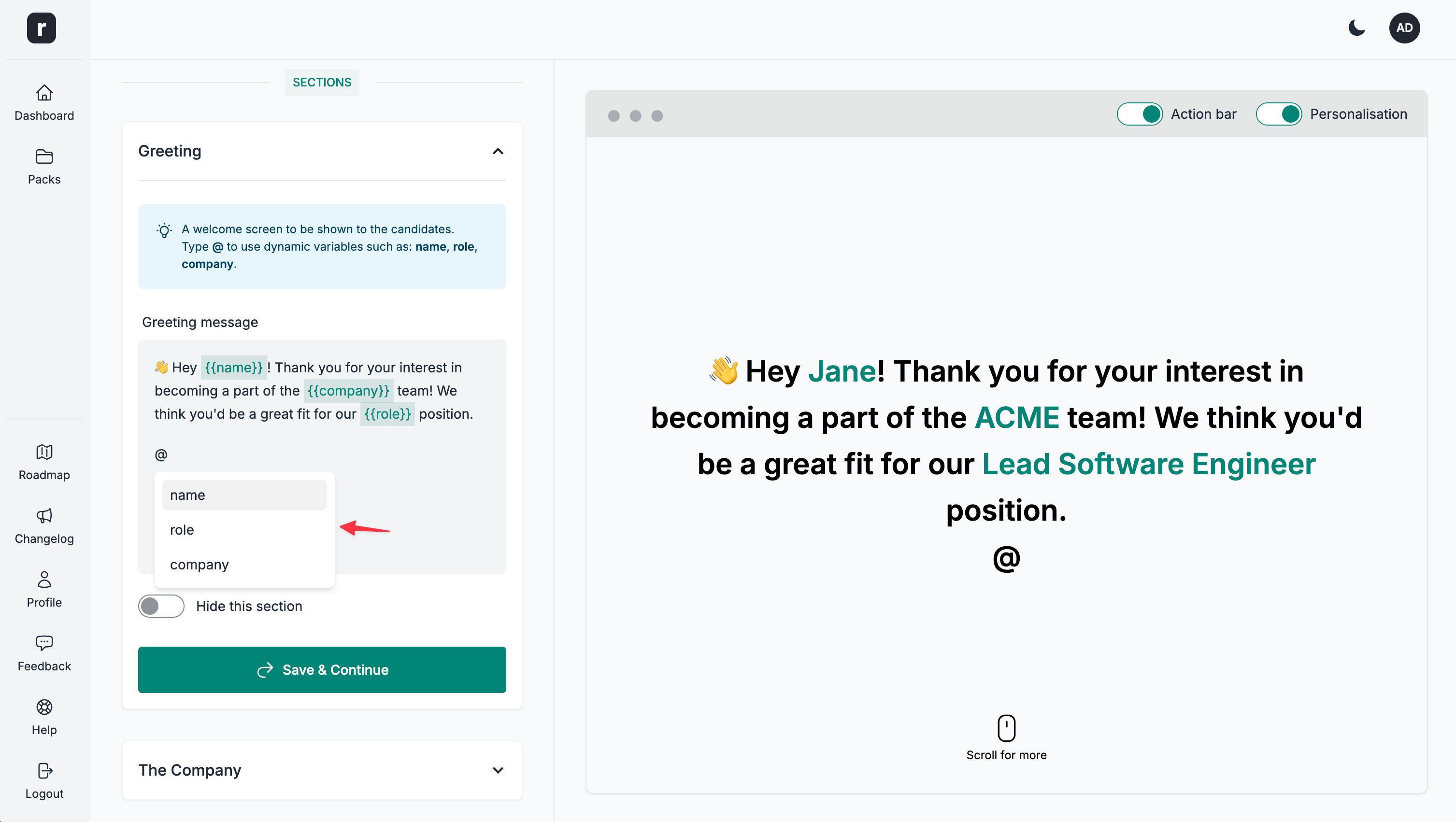 Make it personal, with dynamic variables! You can insert dynamic variables such as: candidate's name, company and role.