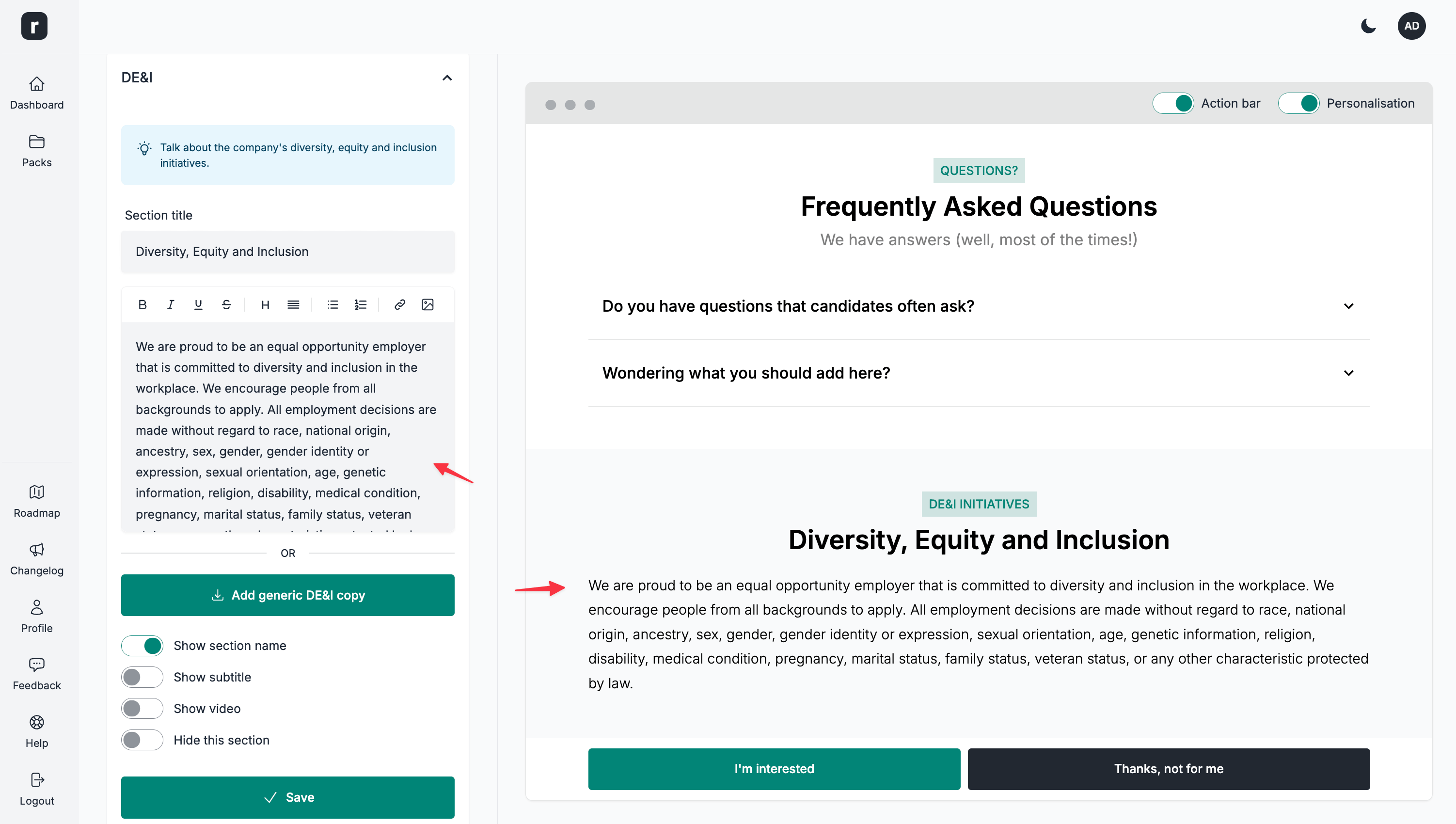 The candidate pack offers you a special section to talk about the company's DE&I framework (Diversity, Equity, and Inclusion). To help you get started, you can add a generic copy. This generic copy is currently available in English only.