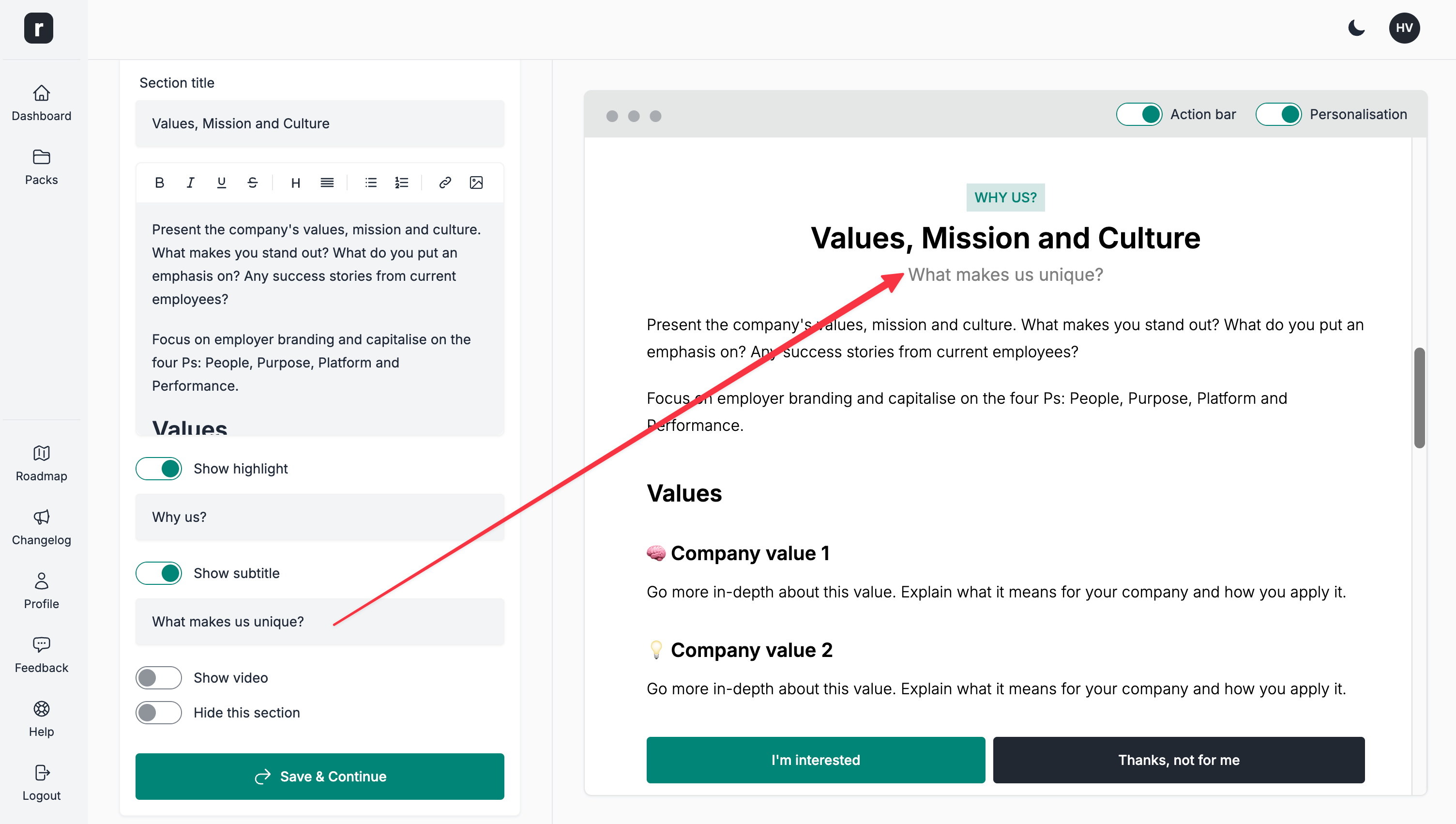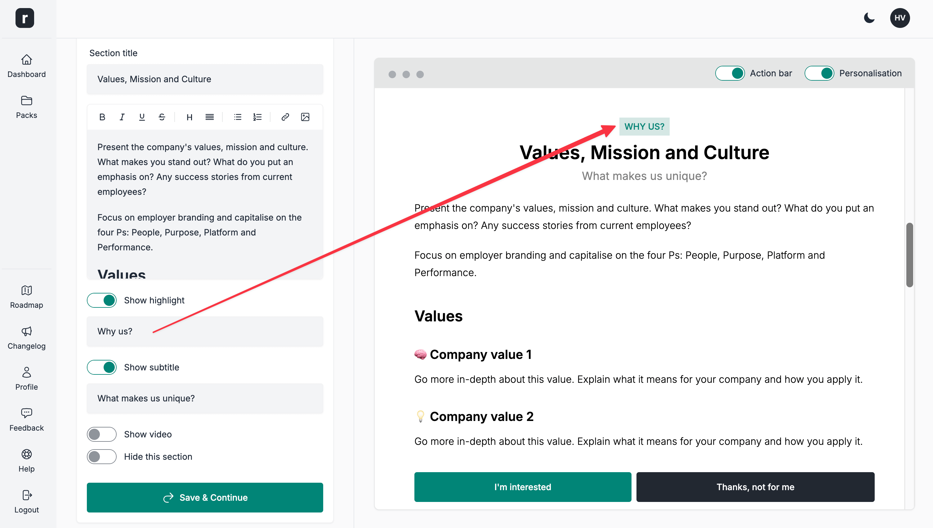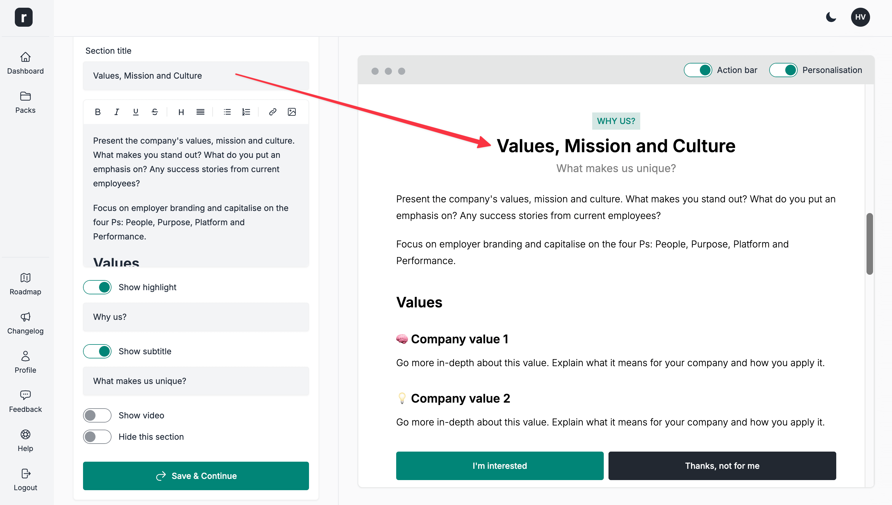 - While changes are immediately visible in the preview, you must save each section in part for the changes to be applied on public candidate pack page. You can save the section by clicking the