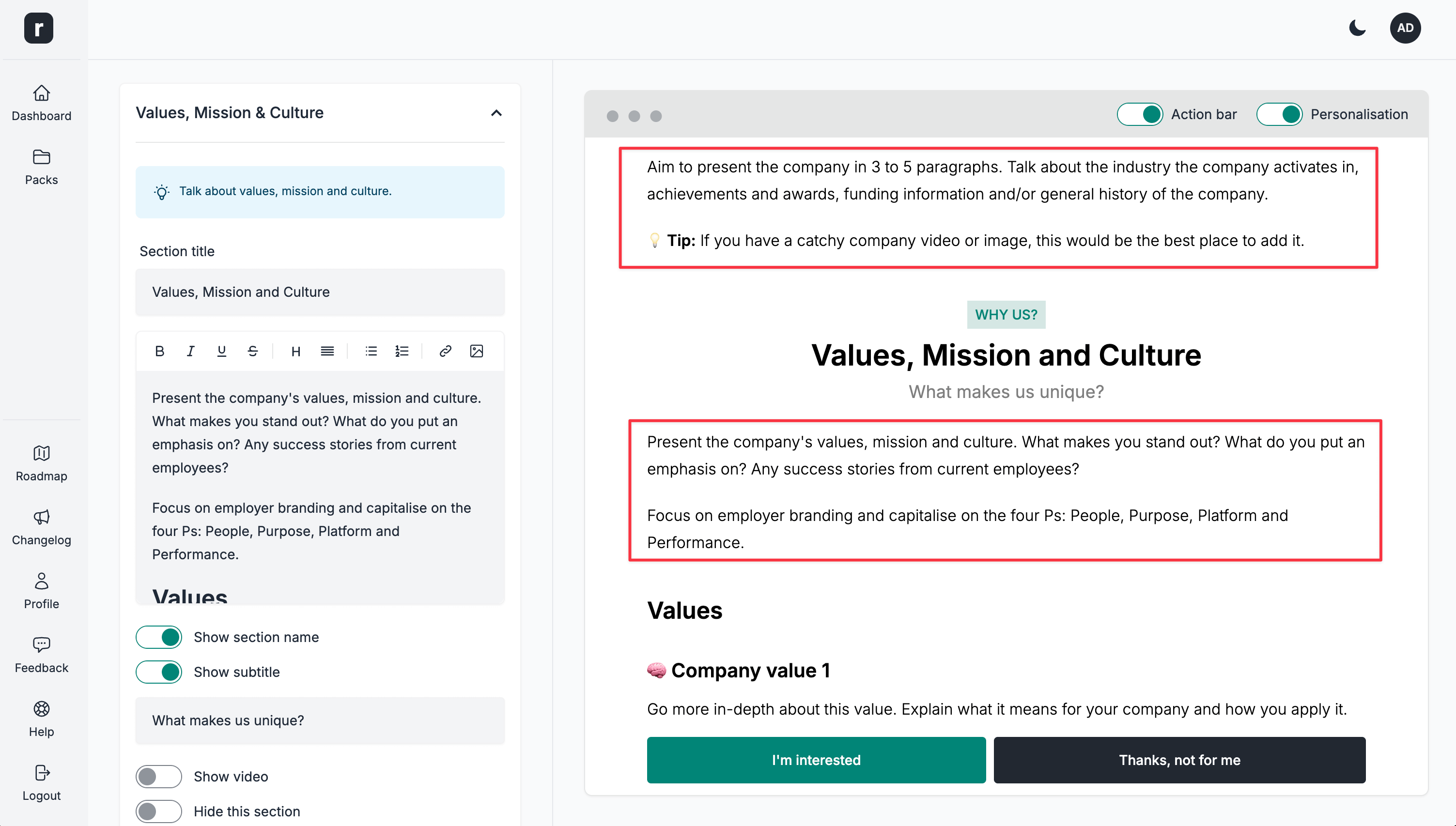 This will populate each section with helpful guidelines and tips to kickstart the candidate info pack creation process for you.